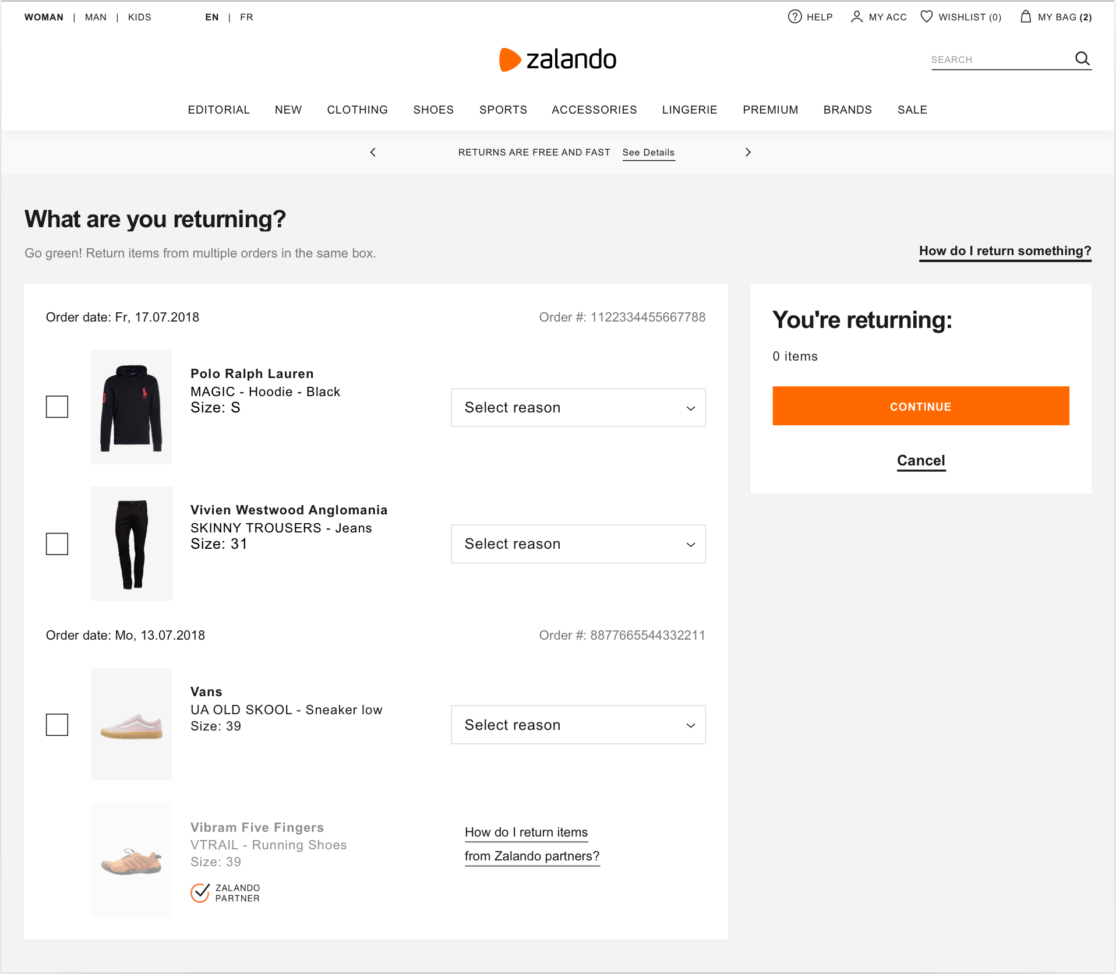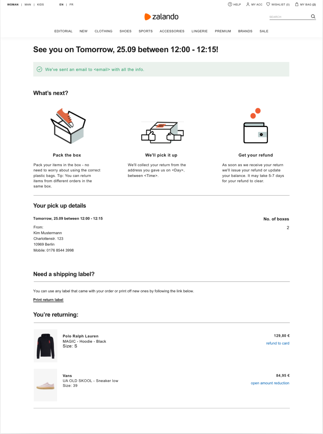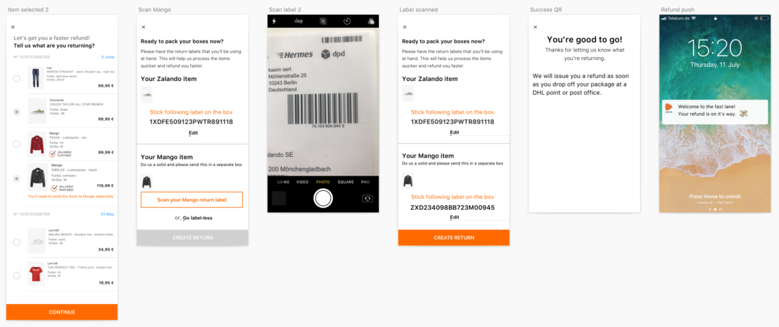 I started working with number of product owners, data scientists and engineers from sizing, sustainability, payments, content and logistics teams to understand the current customer problem from various angles. Our NPS scores also showed that Zalando is one of the most trusted fashion e-commerce platforms because customers liked the simplicity of our offline return process in Germany. After understanding the problem space, I challenged the status quo and the desire of the stakeholders to create a fully online return experience. I hosted a design sprint, where I asked all the participants to think and play from a completely opposite point of view, i.e. to go fully offline. This helped us identify the business problems associated with Zalando’s (then) current return experience even better. Later in the sprint we set the focus on how to incentivize our customers to announce returns online and how do we educate them that this process exists on our platform. Some very interesting ideas came up from the crazy 8 sketching session and based on the votes we further explored those ideas and tested with users. In the end return bundling is something customers really understood and loved so we launched it in Q2 2019.