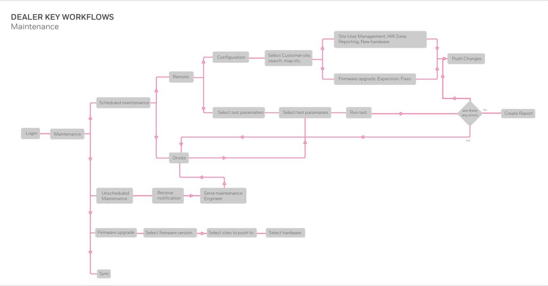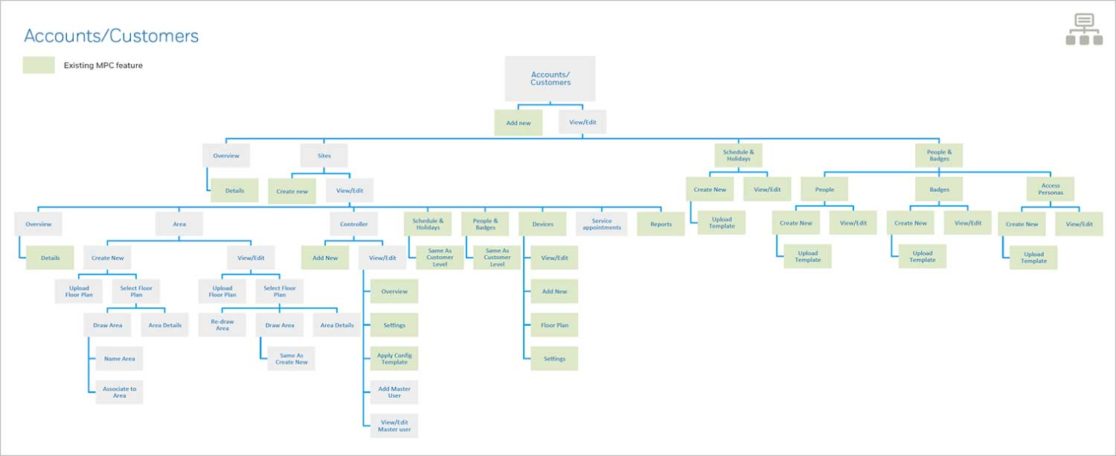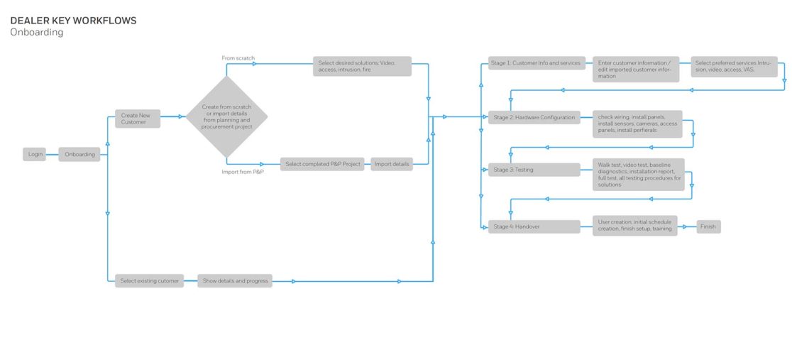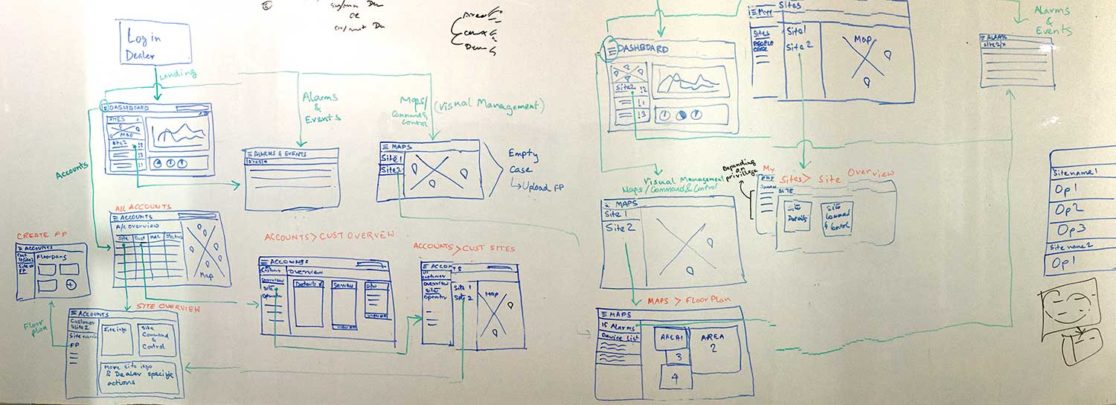 We identified multiple touch points for this new integrated security system such as web, tablet and mobile, depending on the user role. For example, the security admin of a building might want to monitor the status and perform limited tasks at odd hours or when they are off duty on mobile, whereas a system configurator need a fully functional web interface to view and modify system settings.